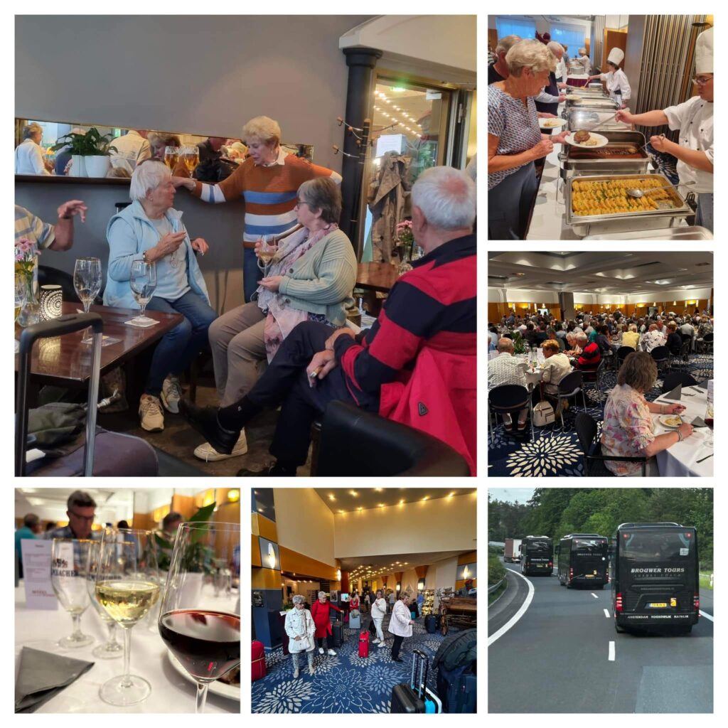 Opstappen om 5.15 uur met vier bussen op het Hoornesplein. Met 220 zangers, echtgenoten en supporters een hele onderneming . Gezonde spanning bij velen. Er komt ook heel wat voor kijken voor je een mooi plekje in de bus hebt. Eerst de auto parkeren, dan bagage verzamelen en de juiste bus kiezen. Gelukkig zijn de bussen ruim op tijd en werkt het weer ook mee. Het is zo waar droog! Half zes vertrekt het gezelschap. Na een koffiestop bij Keulen worden we getrakteerd op een enorme file. Helaas komt daardoor de geplande lunch te vervallen. We rijden, met een korte plaspauze, direct door naar ons hotel in Bayreuth. Na de kamerindeling kunnen we uitgehongerd aanvallen op een heerlijk buffet. Daarna gezelligheid kent geen tijd! Morgen een dagje Neurenberg.